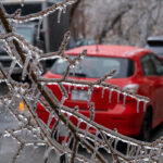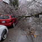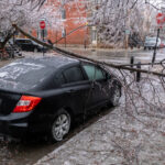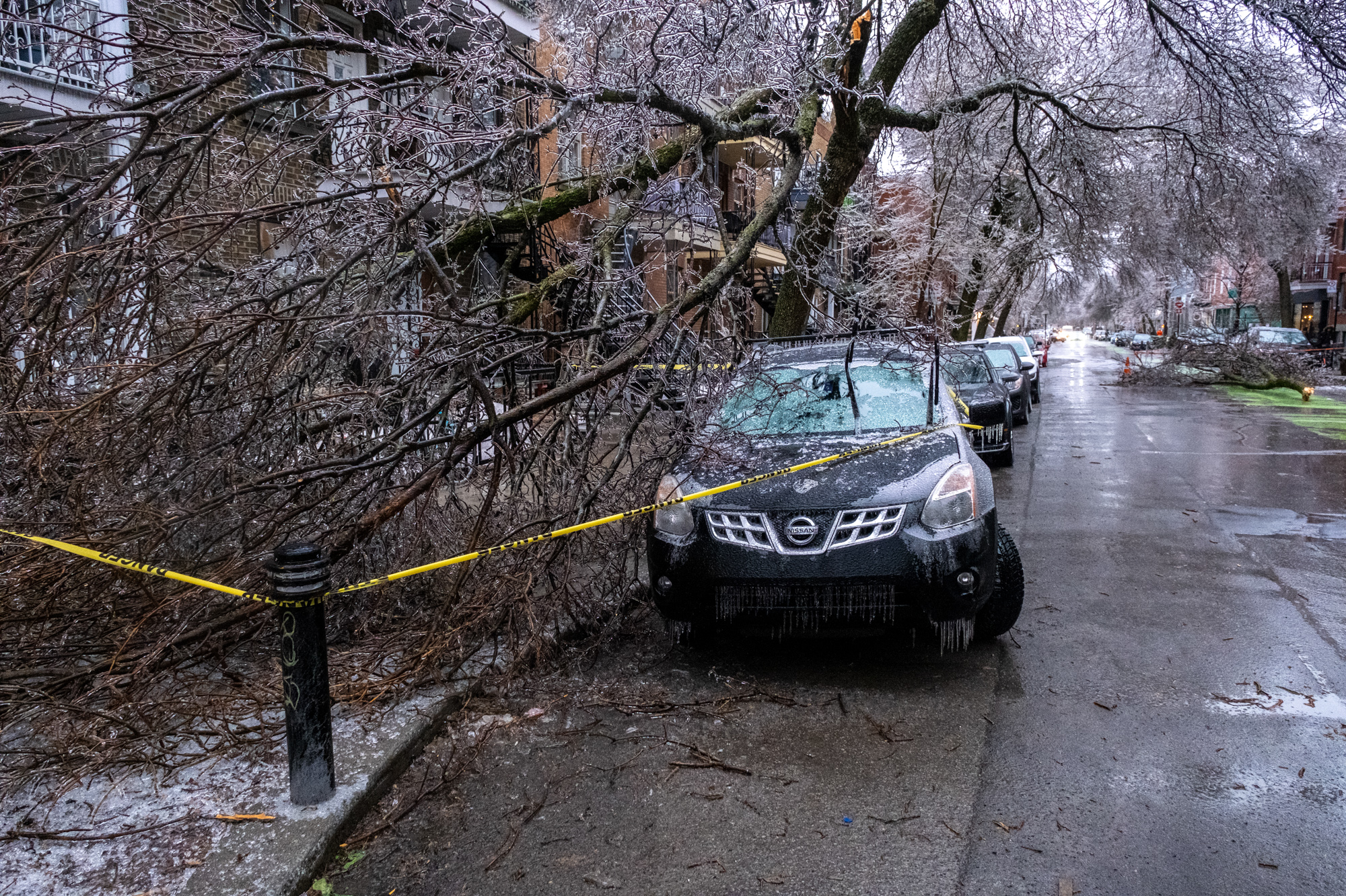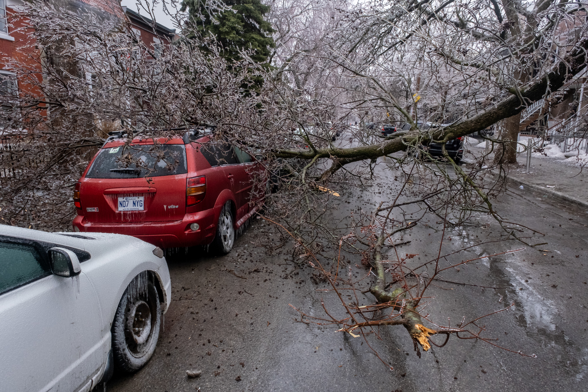 Montreal, CANADA – 5 April 2023: car under broken icy tree after freezing rain