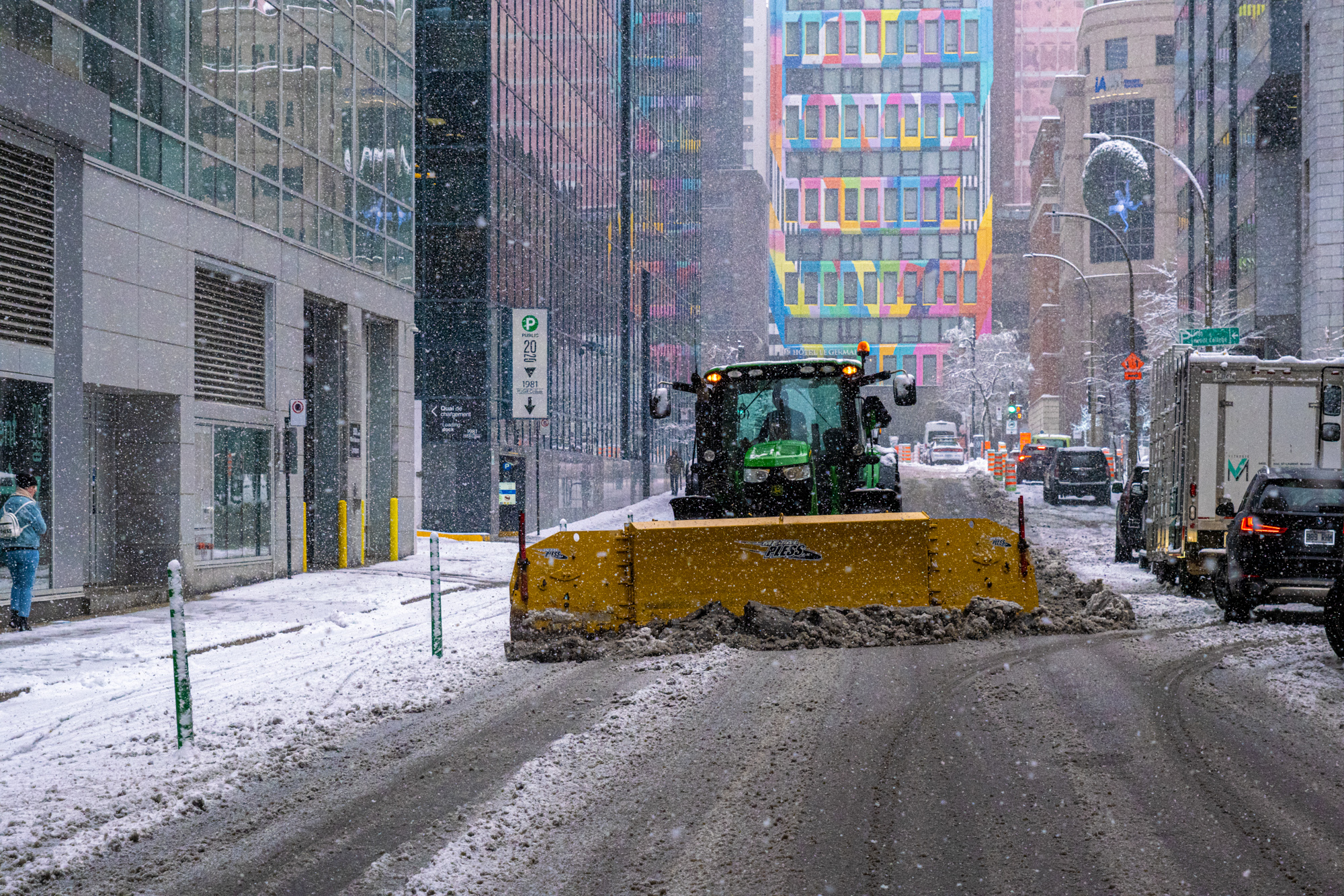 Montreal, CA – 16 November 2022: A snowplow in motion in Montreal Downtown during snow storm