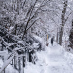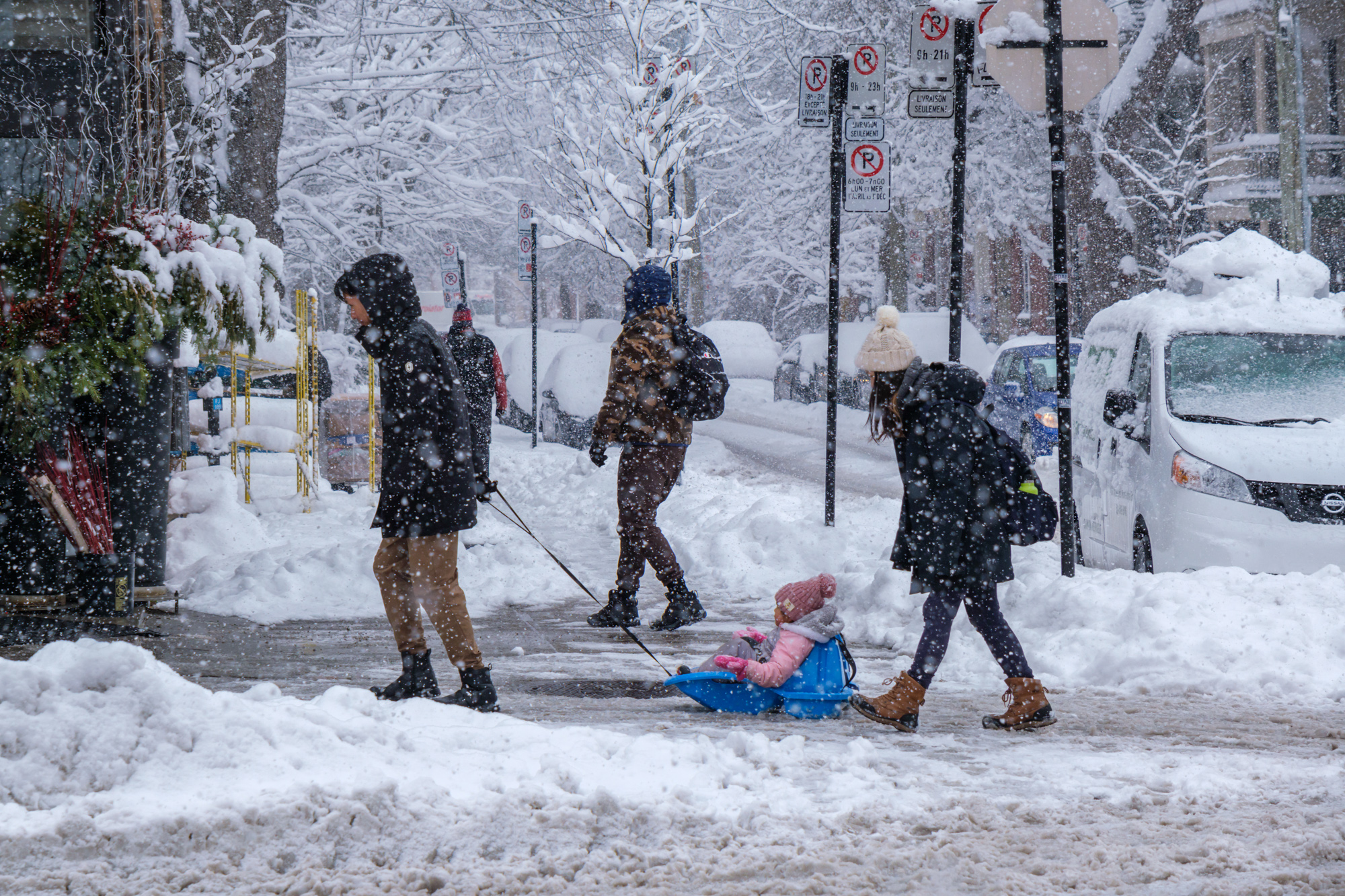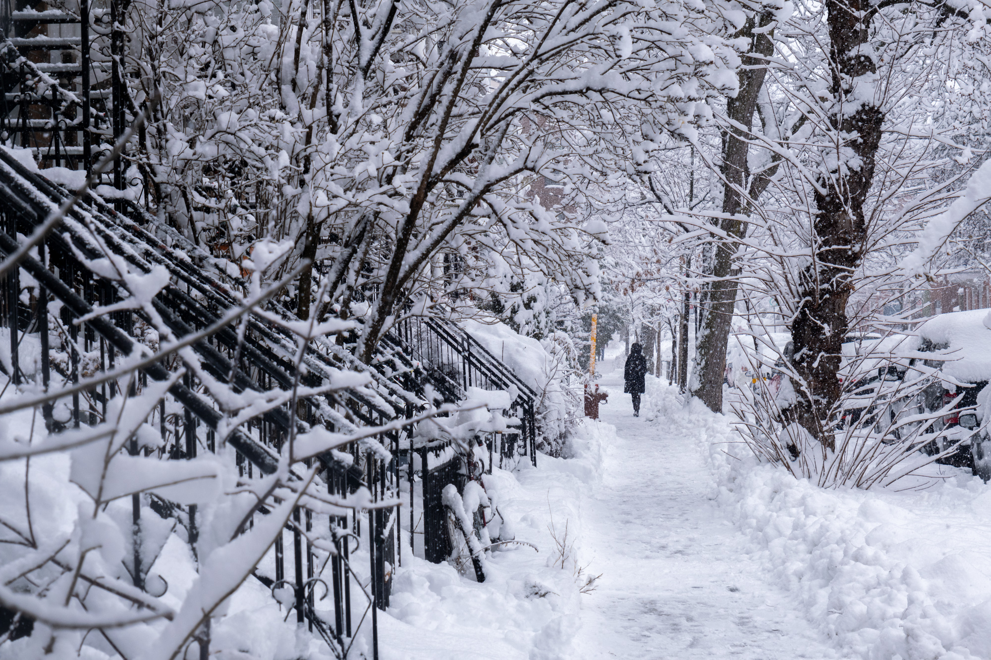 Montreal, CA – 17 December 2022: Pedestrians walking on Mont-Royal Avenue during snow storm