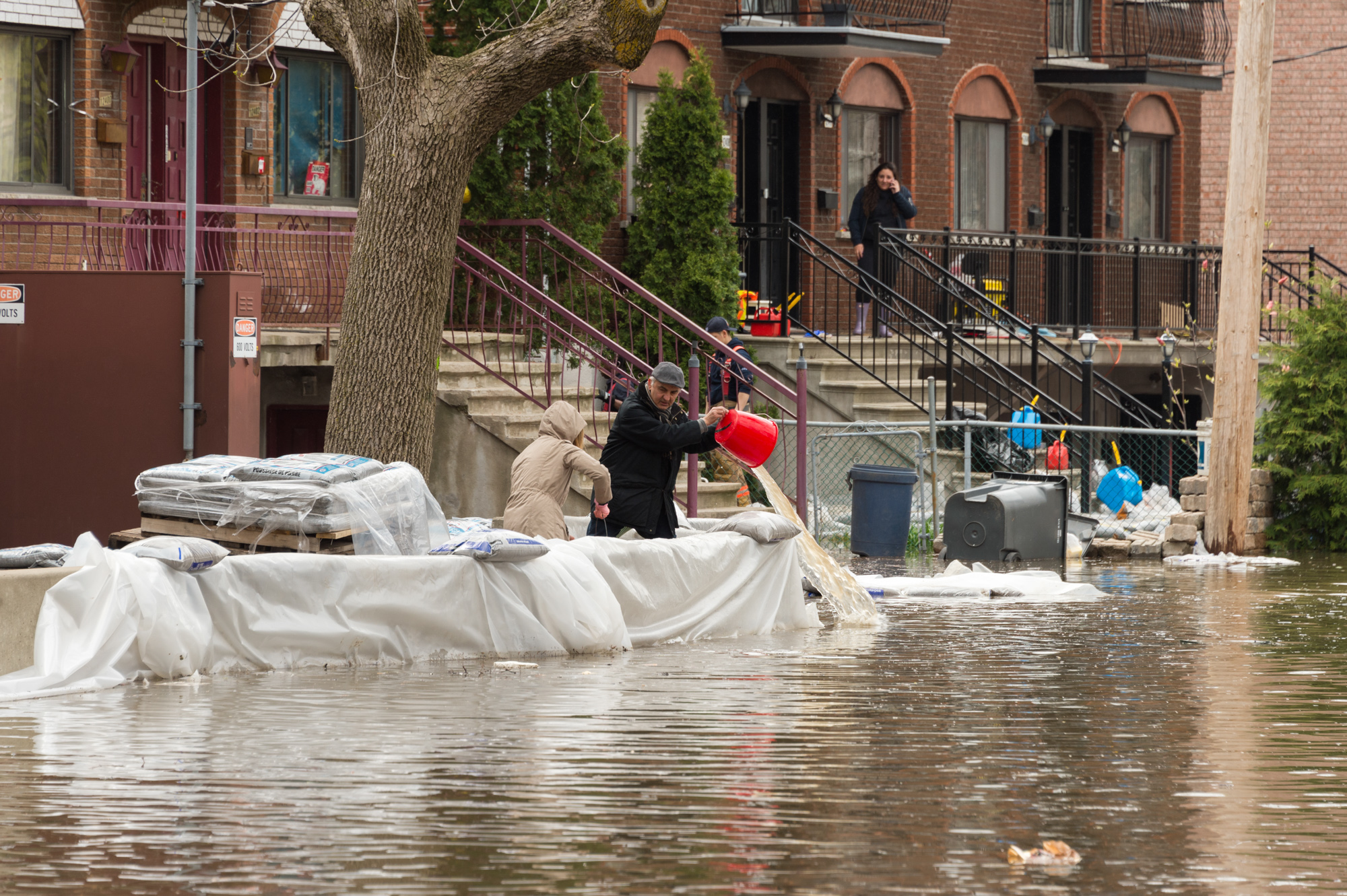 Montreal, CA – 08 May 2017: Residents bail floodwater as flooding hits Cousineau street