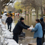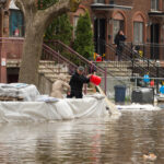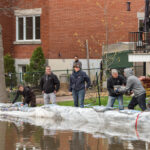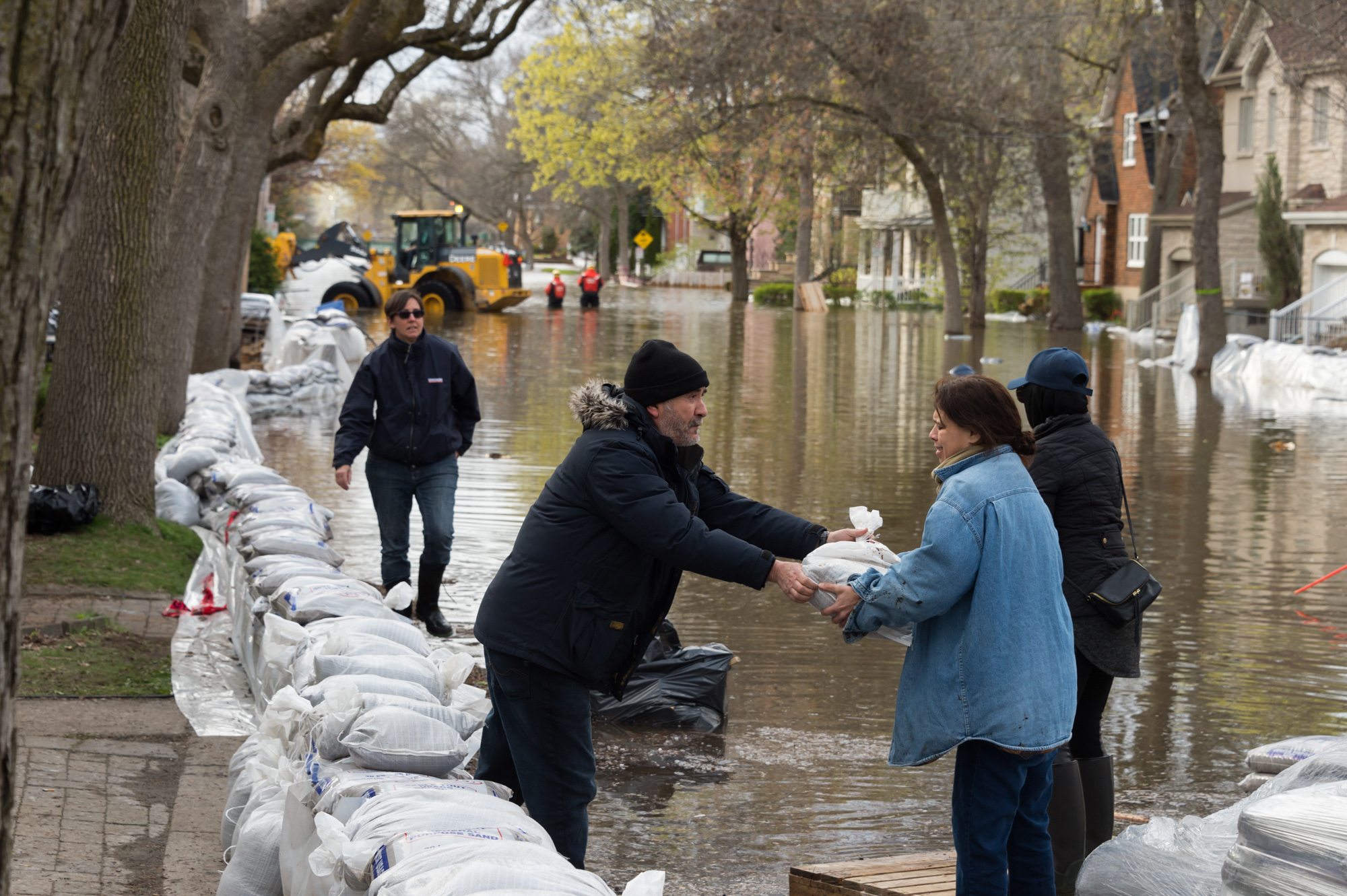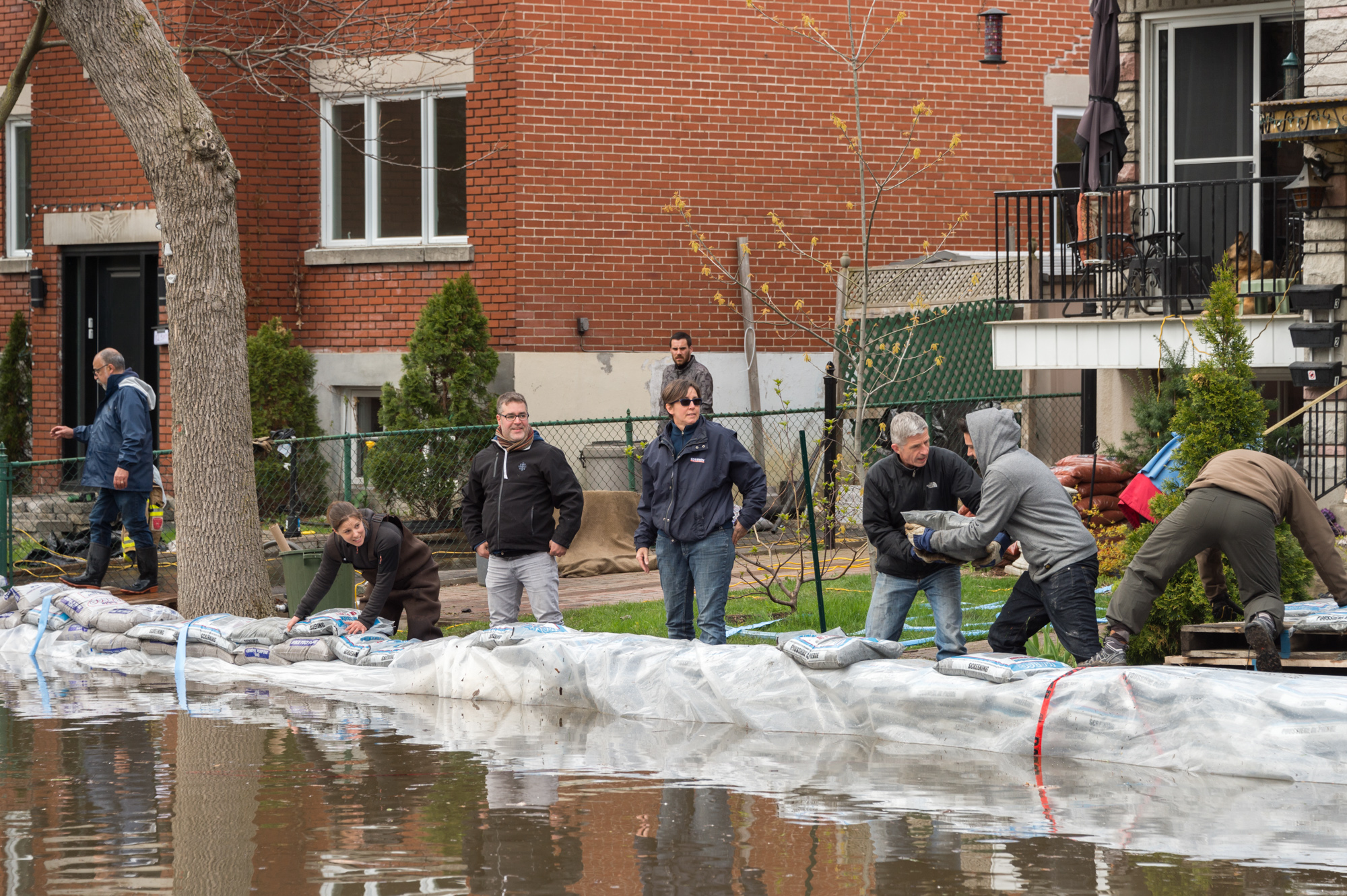 Montreal, CA – 08 May 2017: Neighbors safeguard dams with sandbags as flooding hits Cousineau street