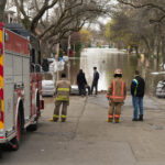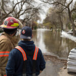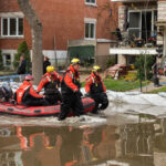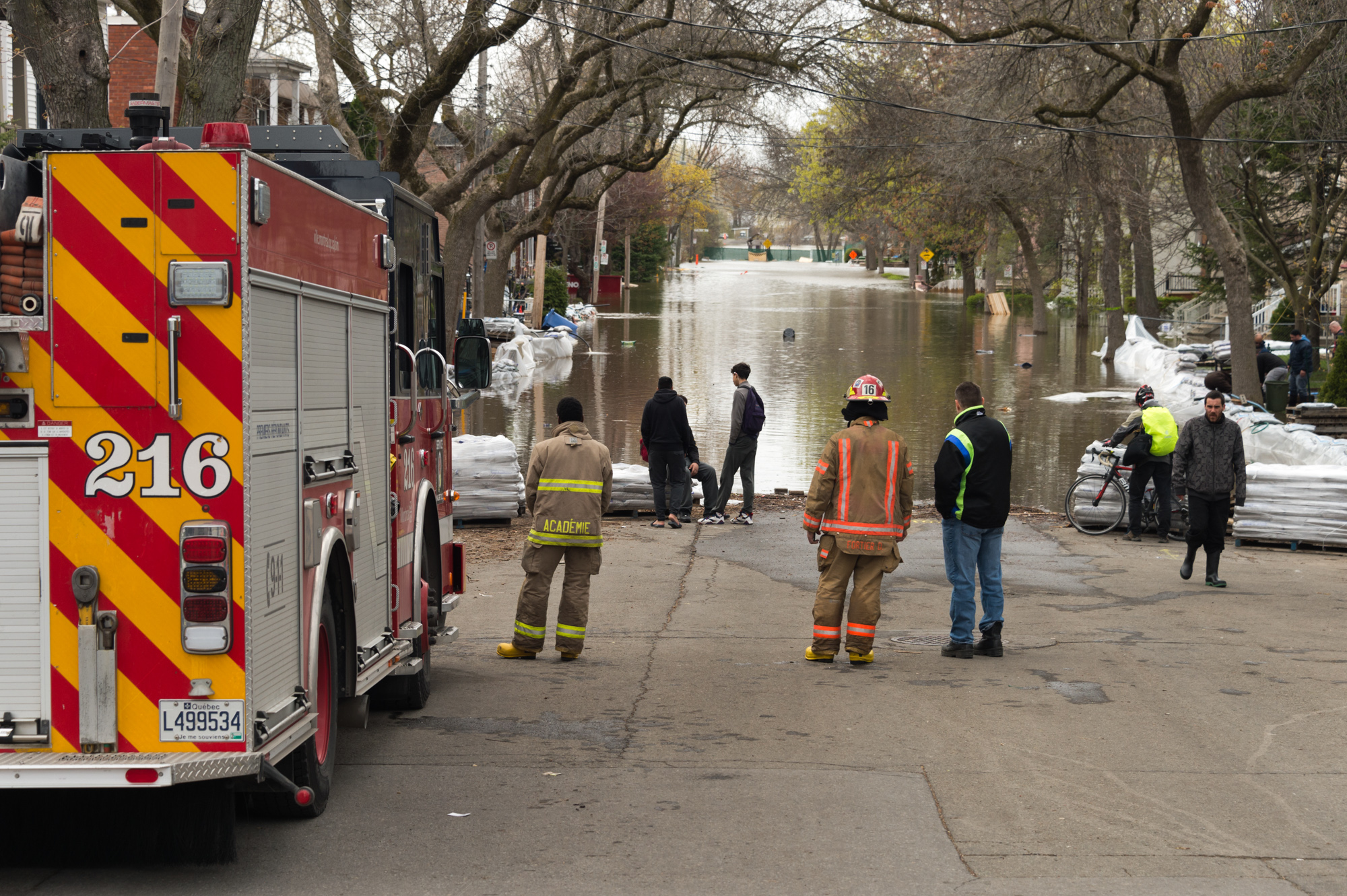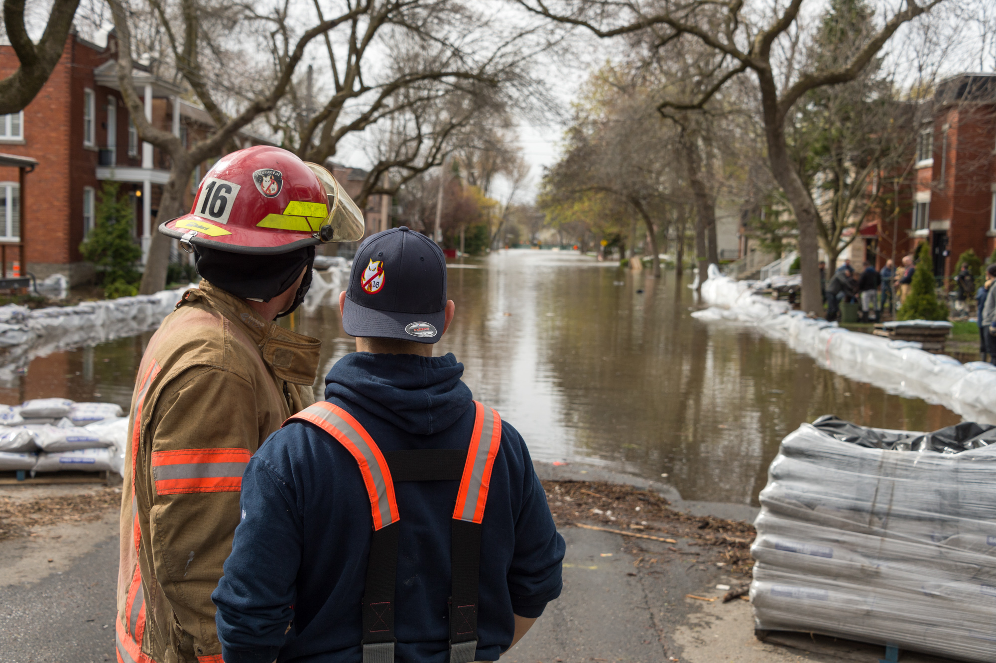 Montreal, CA – 08 May 2017: Firemen evaluate the situation as flooding hits Cousineau street