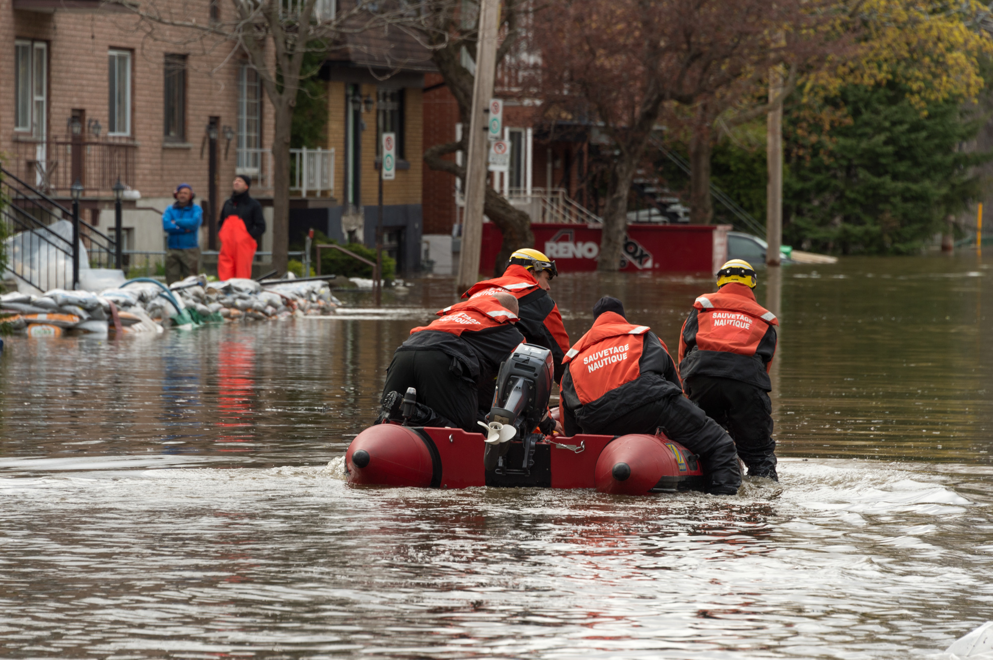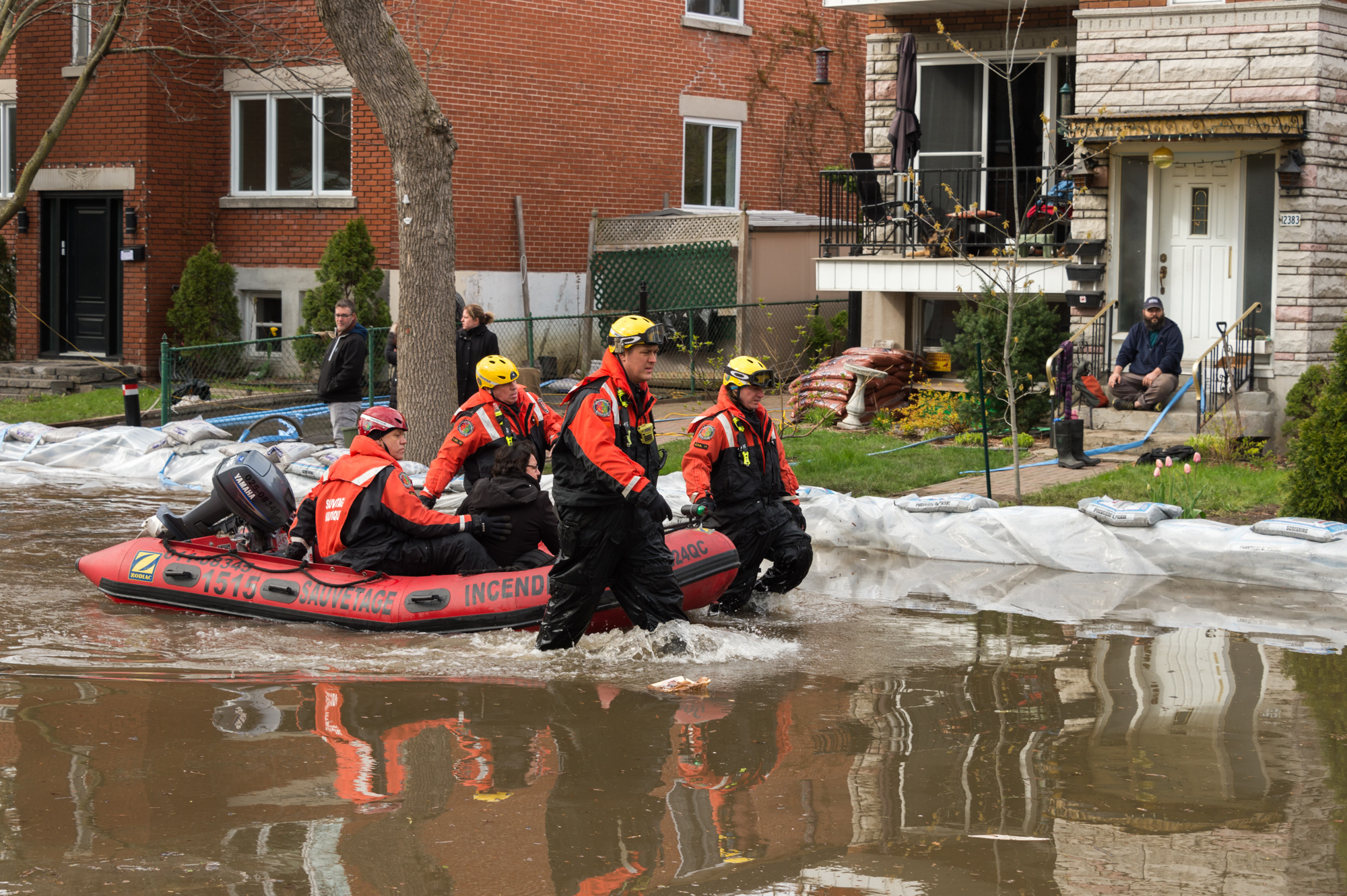 Montreal, CA – 08 May 2017: Firemen use an inflatable boat to help residents as flooding hits Cousineau street