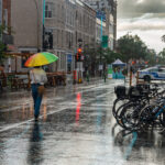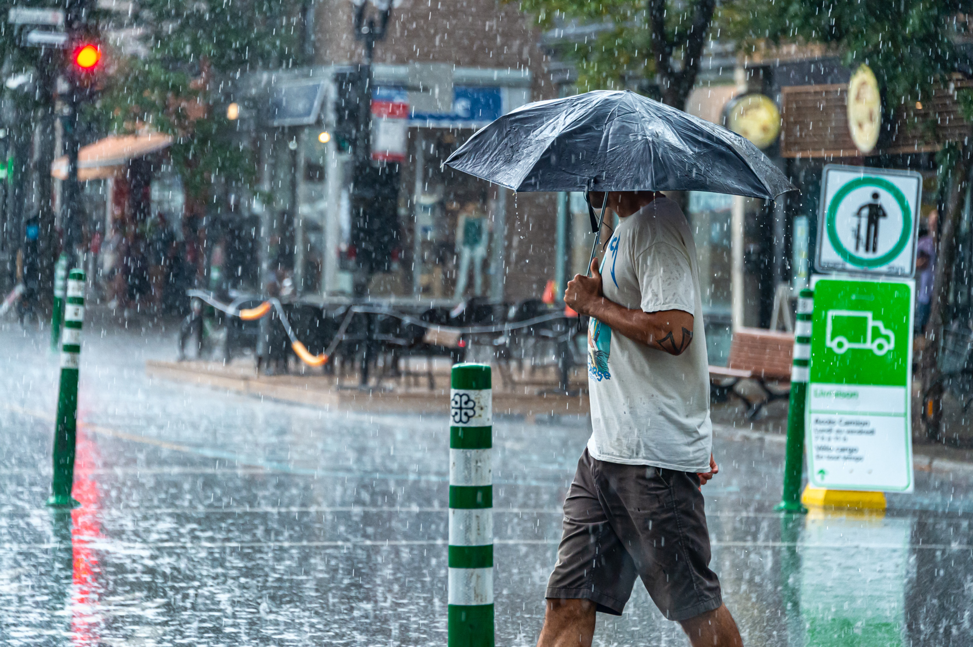 Montreal, CA – 30 July 2020: man on Mont-Royal Avenue holding umbrella during rain & storm