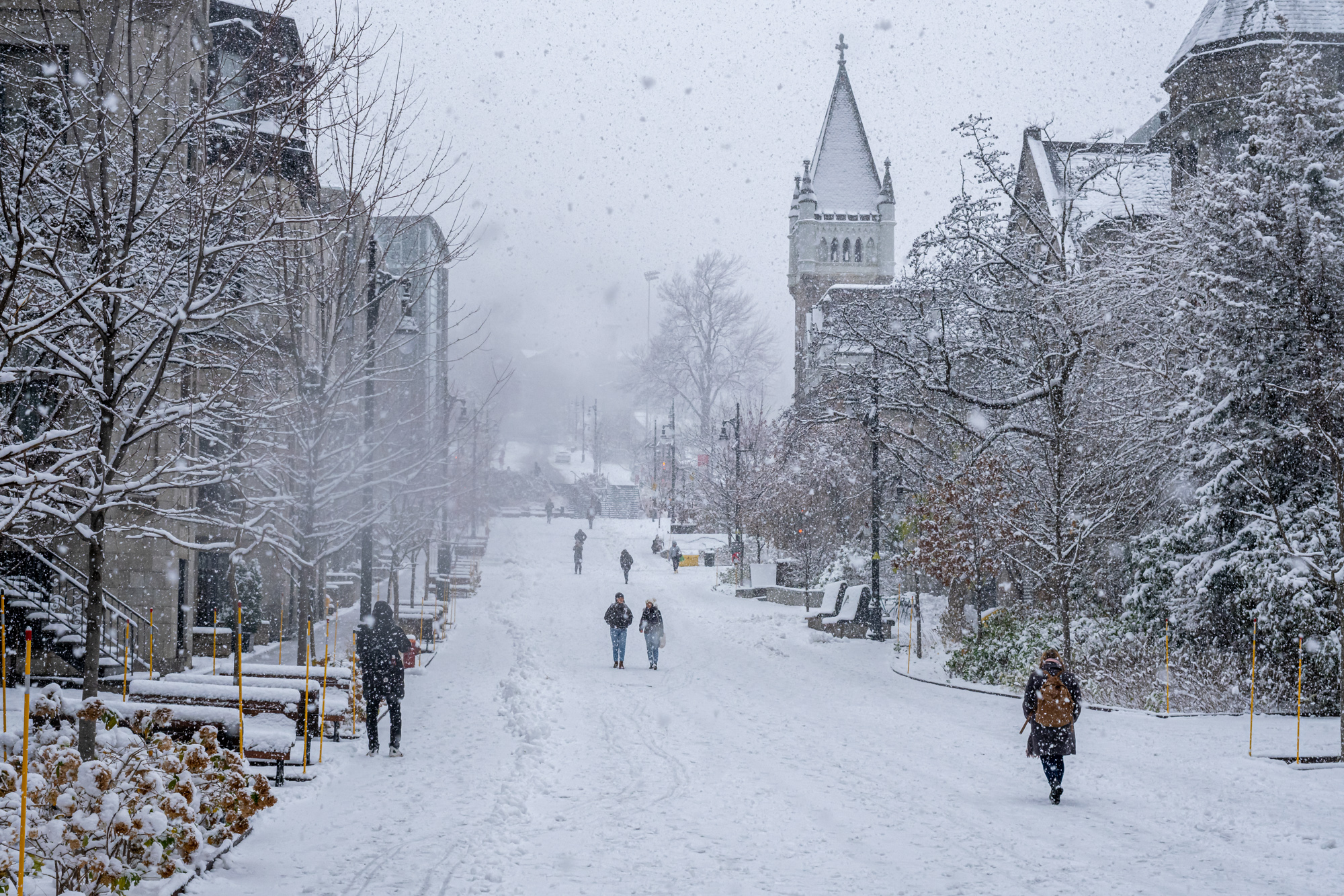 Montreal, Canada – 16 November 2022: Mc Tavish Street and Morrice Hall during snow storm