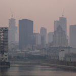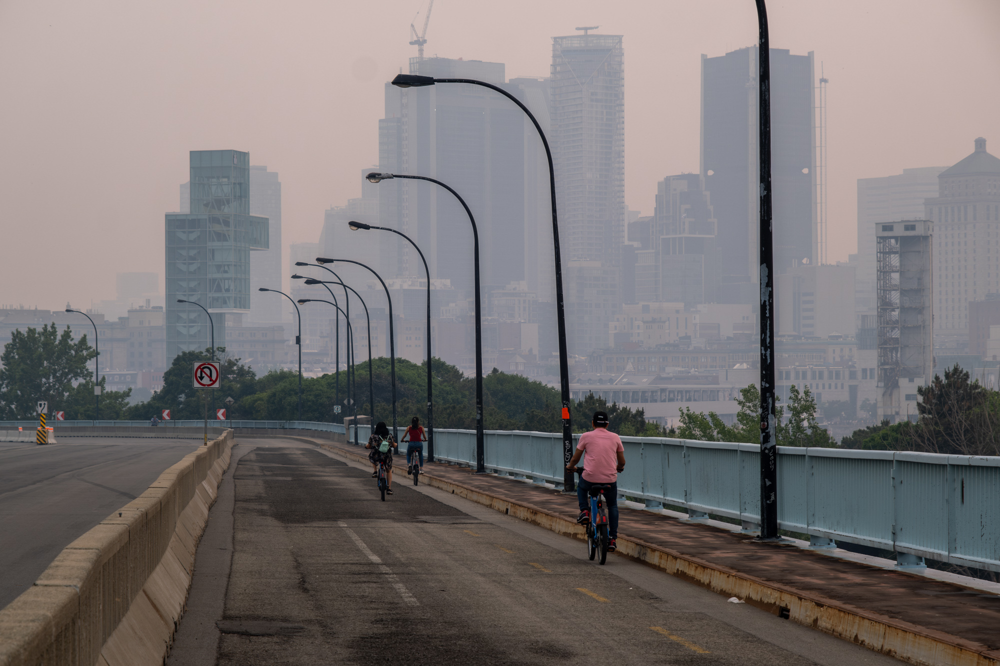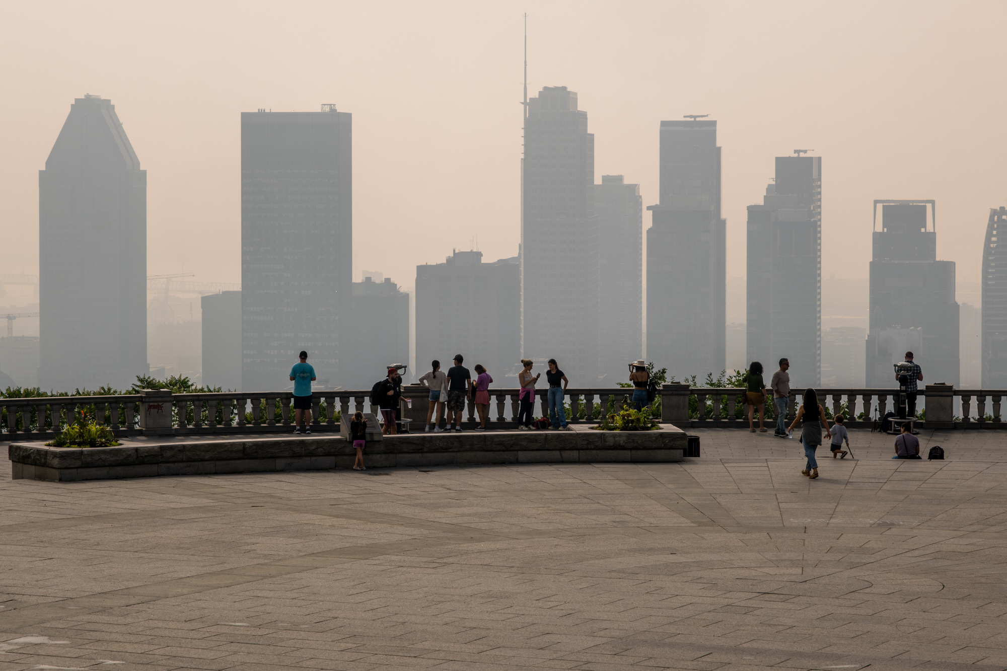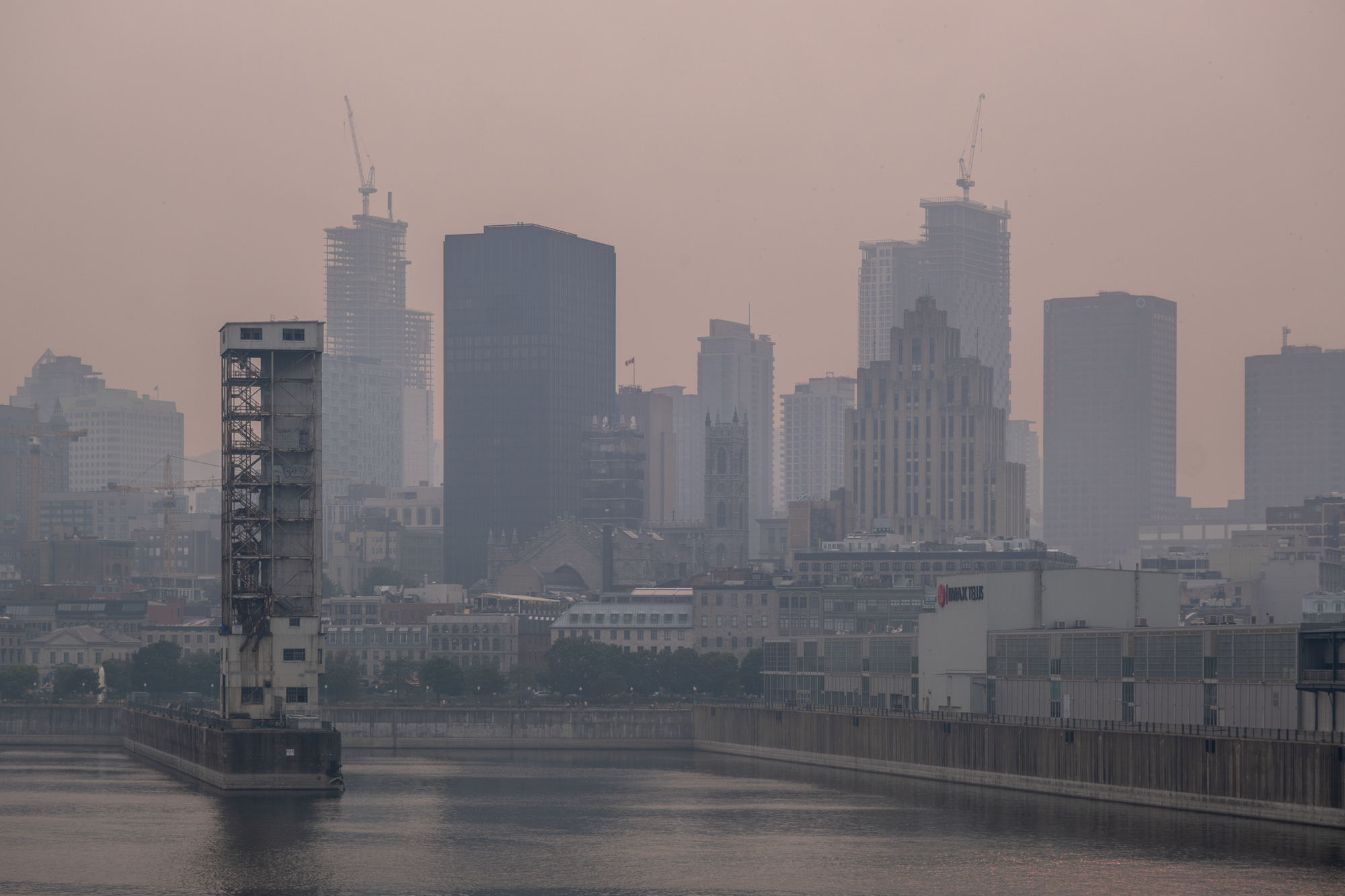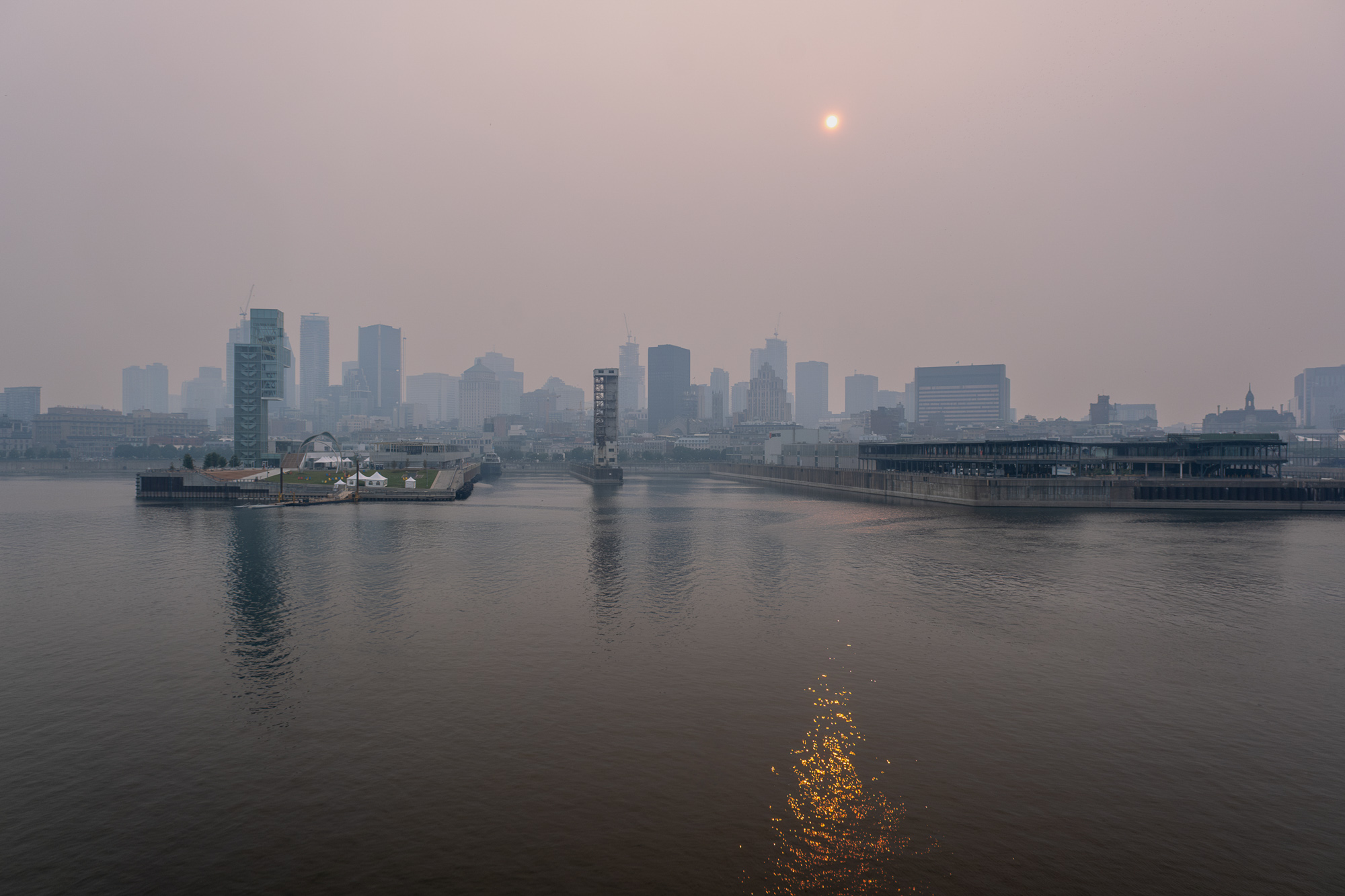 Montreal, CA – 24 June 2023: Montreal Downtown in the smoke of Canadian forest fires