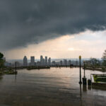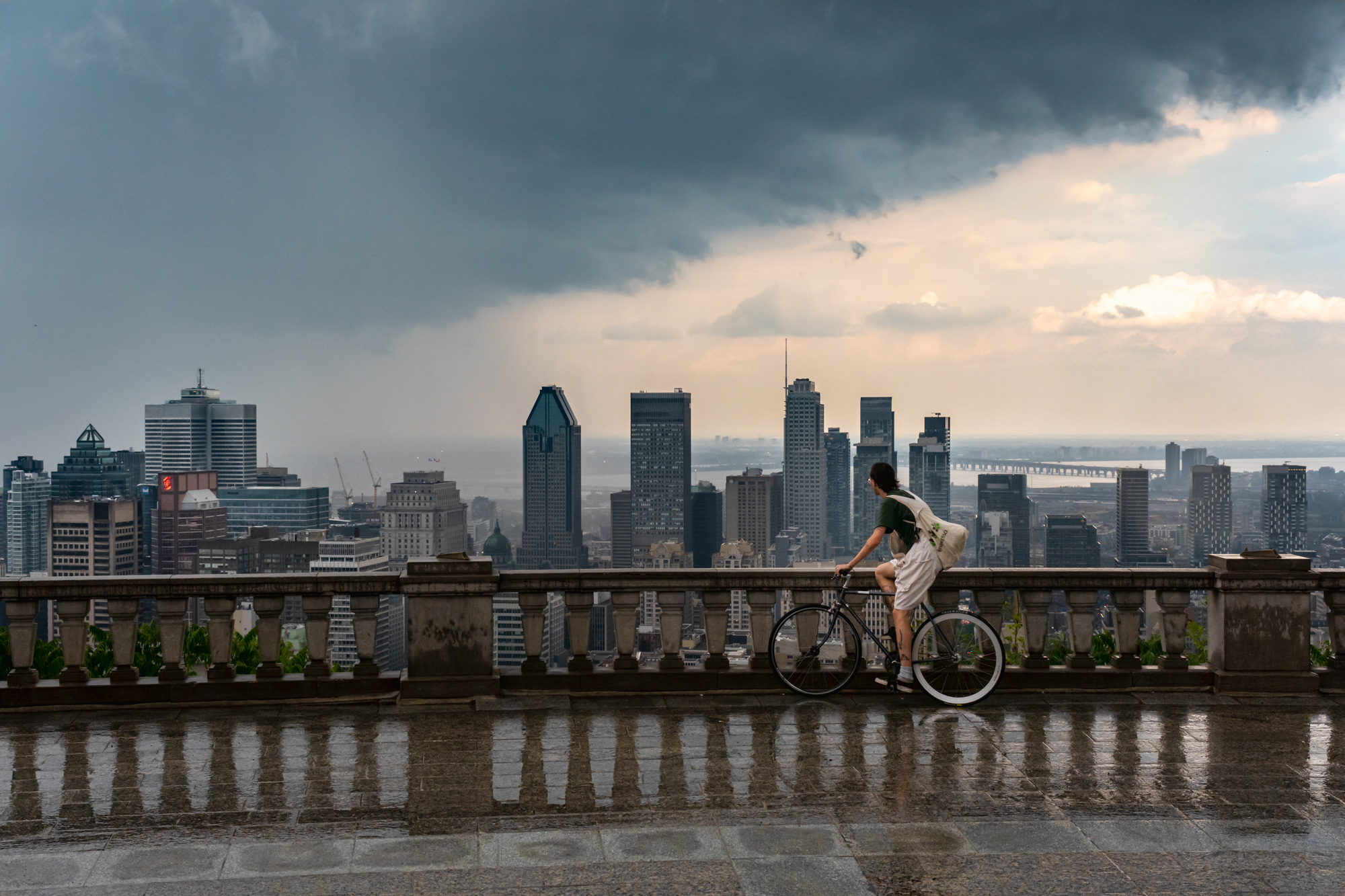 MONTREAL, CA – 6 July 2021:Montreal skyline and skyscrapers with storm clouds and heavy rain