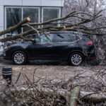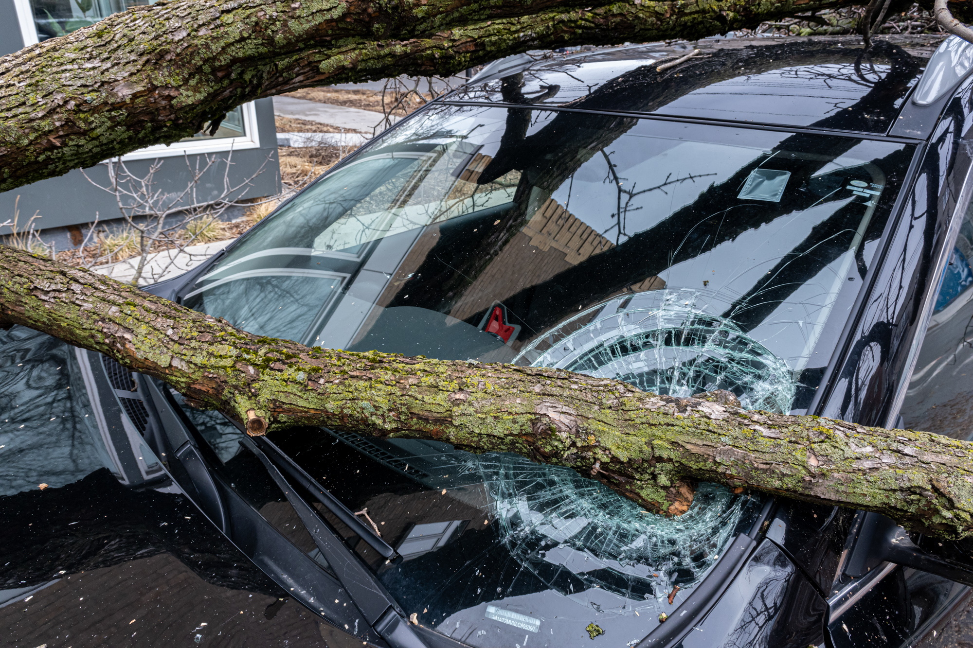 Montreal, CANADA – 6 April 2023: The freezing rain storm broke a tree that fell on a car windshield