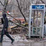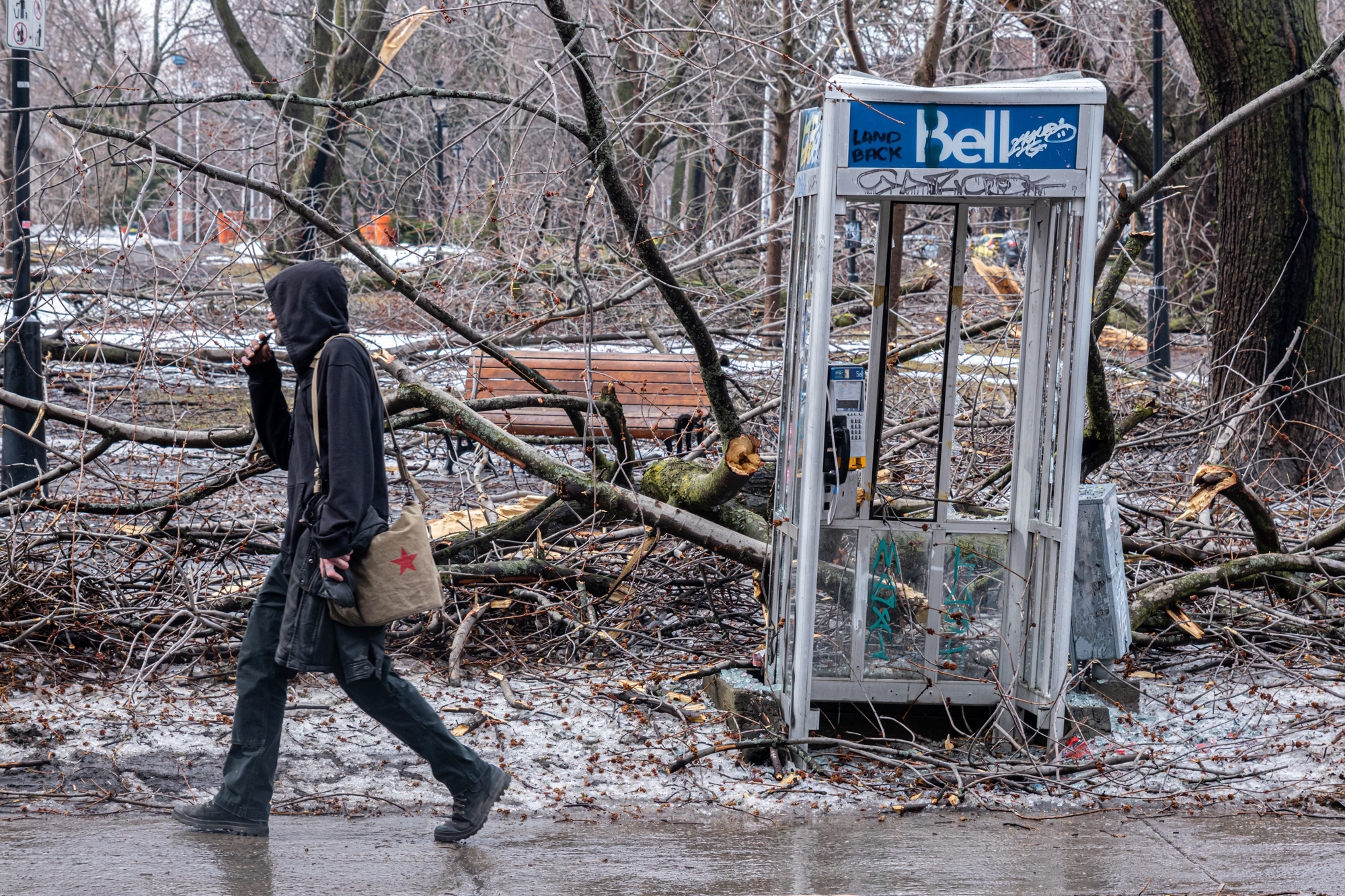 Montreal, CANADA – 6 April 2023: The freezing rain storm has damaged a telephone box near Parc Laurier