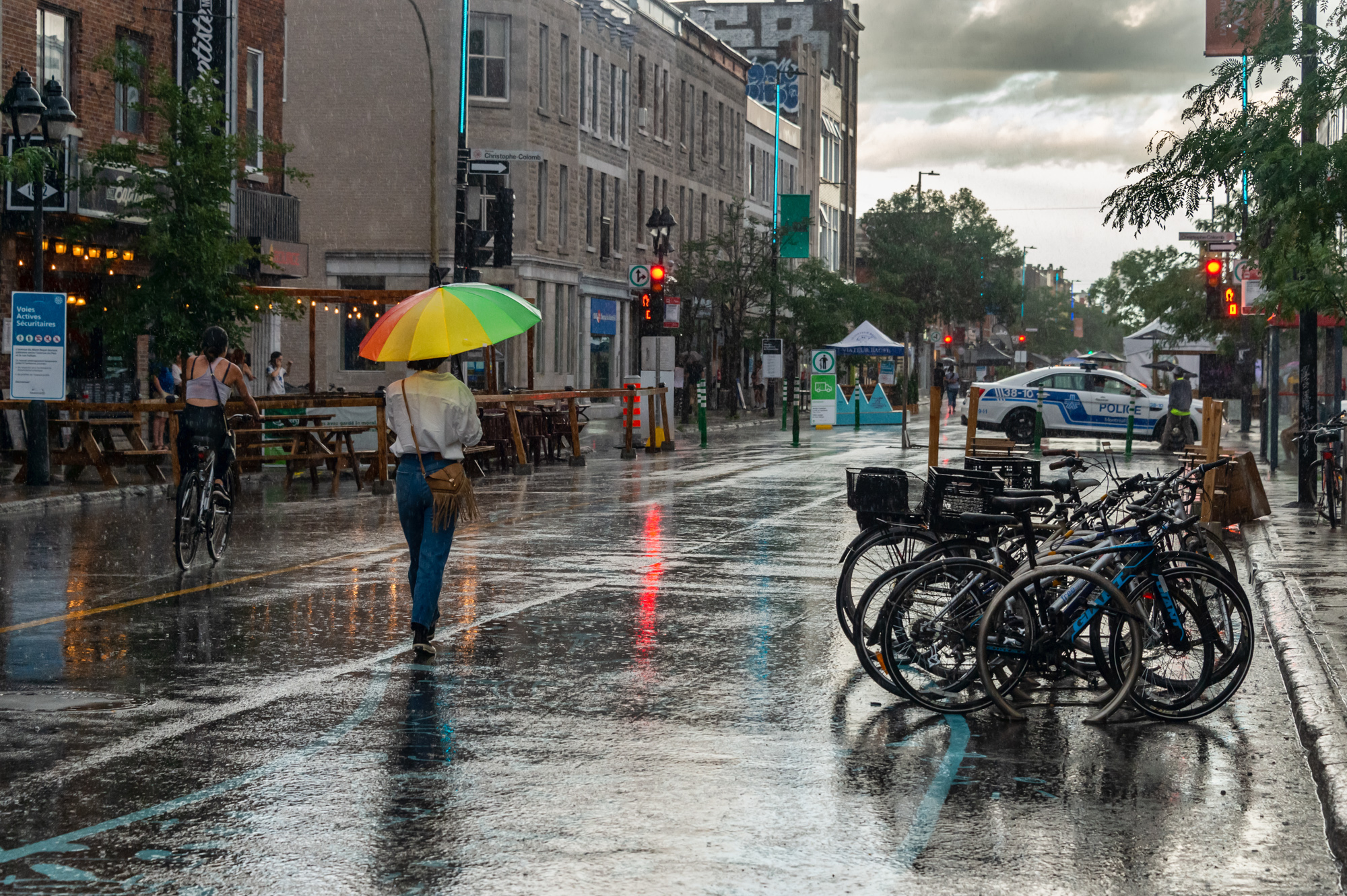 Montreal, CA – 30 July 2020: Woman on Mont-Royal Avenue holding rainbow umbrella during rain & storm