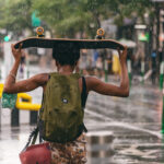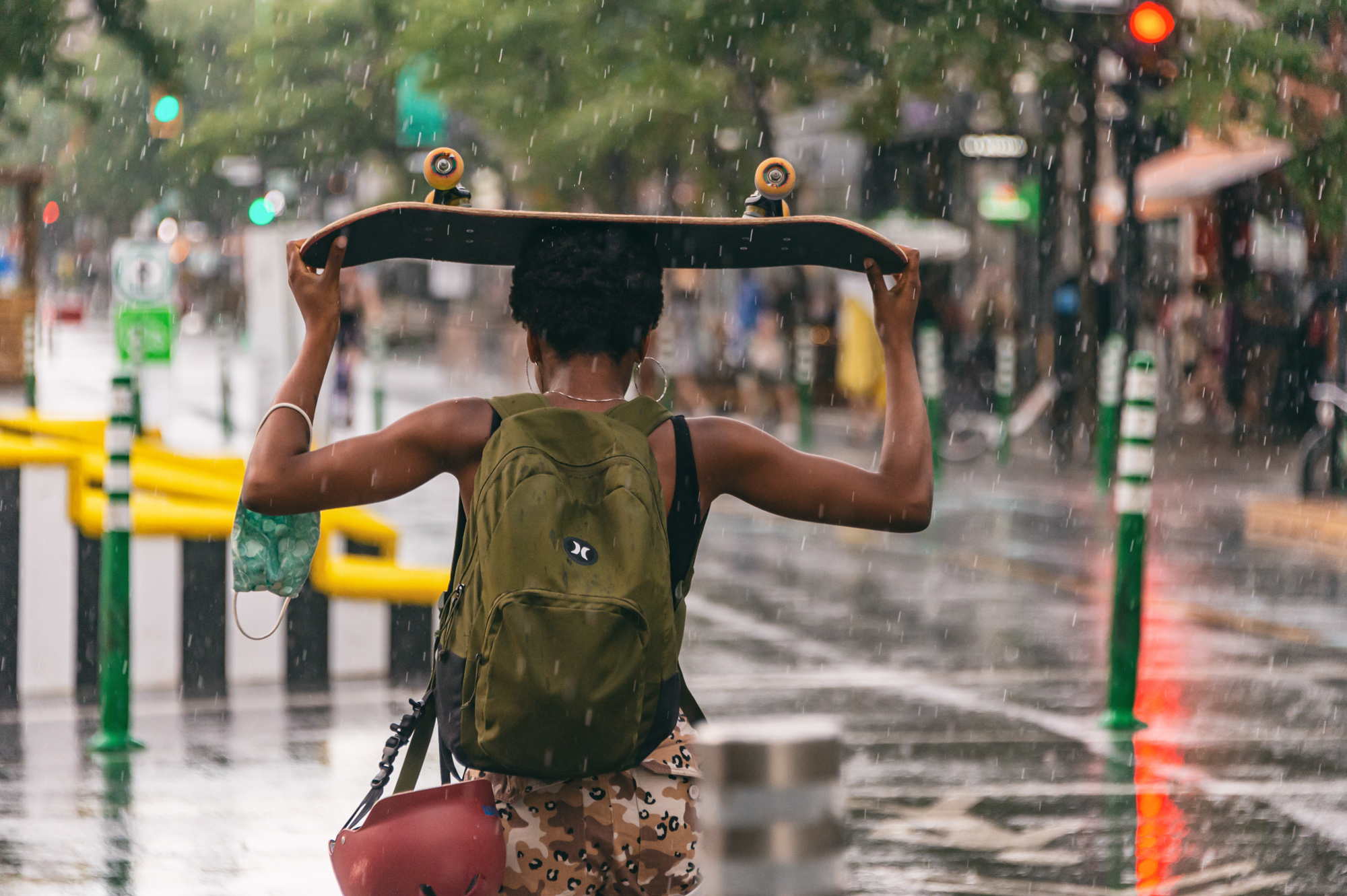 Montreal, CA – 30 July 2020: Woman on Mont-Royal Avenue using skating board as an umbrella during rain & storm