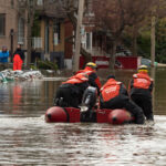 Montreal, CA – 08 May 2017: Firemen use an inflatable boat to evacuate a resident as flooding hits Cousineau street