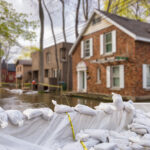 Close shot of flood Protection Sandbags with flooded homes in the background
