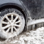 Ice buildup and icicles on a car and close-up of a frozen wheel, in Montreal, Canada.